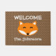 Personalisierter Name niedlicher Rotfuchs Polka dots Türmatte. Braune Naturfarben. Wald-Tier-Vektordesign. Machen Sie Ihre eigenen mit Monogramm mit dem eigenen Polka Punkte Hintergrund. Fügen Sie Ihre eigene Willkommensnachricht, Familienname, Monogramm, Nachname oder lustiges Zitat hinzu. Niedliche Geschenkidee für Freunde, Neugeborene und Familie mit neuen Zuhause / Hauswärmung Party. Benutzerdefinierter Hintergrund für Punkte. Elegante Schriftzeichen-Typografie. Anpassbare Dokumentvorlagenvorlage. Erstellen Sie Ihre eigene Eintrittsmatte / Teppich für Eingangstür / Eingangshalle / Hochzeitsort, Veranda, Garten etc. Individuell gestaltbare Outdoor Wohngestaltung / Dekoration für Ihr Seehaus. Erhältlich in kleinen und großen Größen. Eine lustige Tiersimulation für Erwachsene und Kinder.
