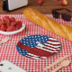 Erstellen Sie Ihre eigenen Personalisierten mit nur Ihren Namen (Familienname), Monogramm, Gruß oder Initialen oder Sprichwort niedlichen Cartoon Regenbogen Einhorn mit einem marineblauen blauen und weißen Sternen mit rot-weiß Streifen usa amerikanischen patriotischen Muster Hintergrund und rote Streifen. Niedliche einhornpatriotische Geschenkideen.