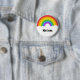 Fügen Sie Ihren eigenen Namen oder eine benutzerdefinierte Nachricht hinzu, um Ihr eigenes Button oder Ihre Schaltfläche zu erstellen. Dieser runde Knopf zeigt eine einfache retro-artige Regenbogendarstellung in hellen Farben mit weißen Wolken unten. Ihr Name oder ein anderer Text erscheint in schwarzer Schrift an den weißen Wolken.
