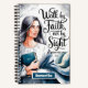 Ein Aquarellporträt einer Frau, die eine Bibel mit einem weichen Hintergrund von Wolken und den Worten "Walk by Faith, Not By Sight" im modernen eleganten kalligraphischen Stil mit Namen personalisiert.