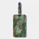 Personalisierte Gepäckmarke in grüner Camouflage hat einen fett weißen Namen auf der Vorderseite und den Namen, die Adresse und die Telefonnummer der Person auf der Rückseite. Das Tarnmuster ist reich an lebendigem Grün mit braunen und grauen Streifen.