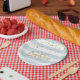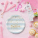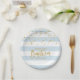 Reizender personalisierter Taufepapier-Teller mit Match mit Servietten. Hellblaue und weiße Streifen mit Imitatgoldconfetti.