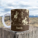 Diese dunkelbraune, personalisierte Western-Tasse hat eine Vielzahl von Rodeo Cowboys in Action Reiten, Seilen und Bronc Busting, verstreut mit Sätteln, Stiefeln und Hüten, auf einem Vintagen Hintergrund.