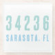 Hochwertiger, einfacher und moderner Zip Code Glass Untersetzer personalisiert mit Ihrem eigenen Zip Code, Stadt und Staat. In schönen, farbenfrohen Farben an der Küste, die mit jedem Dekor an der Küste oder mit der Dekoration des Beach House übereinstimmen. Dieses Design lässt sich ganz einfach mit Ihrem Standort personalisieren.