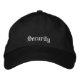 Personalisierte Sicherheit schwarze Baseballkappe, bestickt weiß. Business und Office Idee. Kann mit einem Firmennamen oder Firmenlogo angepasst werden.