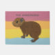 Diese personalisierte Begrüßungsmatte ist ideal für Fans von Capybaras. Es ist bereit, mit Ihrem Namen personalisiert zu sein und bietet eine Abbildung eines Baby Capybara oder Capybara-Jungtier in braun auf einem farbenfrohen gestrippten Hintergrund in Rosa, Orange, Gelb und Hellblau.