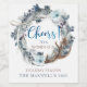 Schönes Weinflaschenlabel für Feiertage mit der Möglichkeit, Text für Weihnachten oder Neujahr zu personalisieren. Herrlicher Aquarell blauer Blumenkranz mit der Phrase "Cheers" in blau Aquarellschrift Schrift Typografie. Vier Textbereiche mit der Möglichkeit, die Nachricht nach Ihren Wünschen anzupassen, unsere Optionen sind nur ein Vorschlag, fühlen Sie sich frei, das Etikett an Ihre Bedürfnisse anpassen Anzug. Teil unserer "Blue and Silver Watercolor Christmas" Kollektion mit einer Vielzahl von Produkten zur Koordination.
