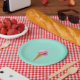 Herzlichen Glückwunsch zum Geburtstag Party Teller mit einer Eiscreme und einer Geburtstagskandle auf türkisfarbenem Hintergrund.