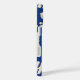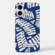 Blue Leaf Illustration personalisiert iPhone Gehäuse. Blättermuster auf blauem Hintergrund mit Textnamensfeld in der unteren Mitte.