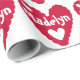 Valentinstag Geschenkpapier mit einem roten Herz mit kleineren weißen Herzen und weißem Text, die Sie mit einem Namen auf einem weißen Hintergrund personalisieren können.