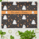 Ein lustiges schwarzes Küchentuch mit einem niedlichen Halloween-Gespenst-Muster, personalisiert mit einem Namen. © ArianeC Illustrations-Alle Rechte vorbehalten