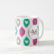 Ein buntes Herz-Muster in Rosa-, aquamarin- und Grautönen personalisiert mit einem Namen und Monogramm. Ersetzen Sie den Beispieltext mit Ihrem Namen und Monogramm und Sie sind alle Set.
