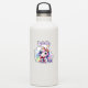 Niedlicher Mädchenname personalisierter Party-Aufkleber mit einem bezaubernden Cartoon Regenbogen Einhorn mit einem Geburtstagshut auf dem Besitz eines Geschenks mit einem Regenbogen im Hintergrund.
