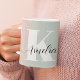 Personalisierte weise grüne Tasse mit dem Monogramm-Initial in der modernen großen weißen Typografie und Ihrem Namen in einem stilvollen Kalligrafieschrift.