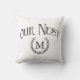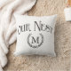 Das "unser Nest-" Wurfskissen hat ein rustikales, Bauernhausartgefühl mit dunkelbrauner Beschriftung und kennzeichnet ein hölzernes Muster der Scheune auf der Rückseite. Auf der Front: Sie können mit Ihren Initialen in der Mitte des Lorbeer-Kranzes personifizieren und/oder ändern Hintergrundfarbe. Auf der Rückseite: Sie können Ihren eigenen kundenspezifischen Text addieren.