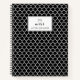 Personalisiertes Black Quatrefoil Muster Notebook. Anpassbare Notizbücher mit schwarz-weißem Quarrefolienmuster, moderner Kalligraphie, einfacher Typografie und Bugakzent. Dieses moderne Notizbuch wird als personalisiertes Geschenk perfekt sein. Mischen und mit anderen Farben und Gegenständen.