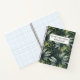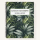 Das Bild zeigt ein spiralgebundenes Notebook mit dunkelgrünem Hintergrund mit verschiedenen grünen und weißen Blätter. In der Mitte des Covers befindet sich ein weißes rechteckiges Etikett mit einem grünen Rand.