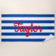 Dieses Strandtuch weist blaue und weiße Streifen auf. Dieses Badetuch wird in einem großen roten Schriftart über die gesamte Länge des Handtuches mit Ihrem Namen oder Ihrem Wunschtext personalisiert.