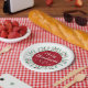 Elegantes und modernes Weihnachtswerk mit Tellern in rotem Aquarell mit Weihnachtsfloralen. Text kann durch einen eigenen ersetzt werden