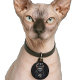 Personalize Grim Reaper Sphynx Cat Funny Pet ID tag for cats. Featuring a realistic Sphynx cat grim reaper in a black hooded robe with skeleton hands holding a scythe, an exclusive 'Sphynx Cat Art' design cat id tag. Add Sphynx Cat owner's contact information on the back of this identity pendant cat ID tag, and the cat's name on the front. A must-have for any cat parent, in the event that your hairless Sphynx cat or kitten escapes or gets lost.