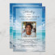 This elegant memorial card features a serene blue sky and ocean-inspired background with a refined gold-framed photo area, symbolizing calm, remembrance, and hope. The light, airy design offers a comforting alternative to darker memorial styles, making it ideal for celebration of life services.