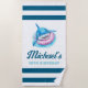 This personalized beach towel with blue stripes and a playful shark illustration is part of the Waterpark Birthday Collection, created to complement a fun and vibrant boys’ birthday celebration. Designed as both a practical item and a stylish birthday decoration, this towel works perfectly for pool parties, waterpark birthdays, and summer-themed celebrations. Customized with the birthday boy’s name, it adds a coordinated look to your party decor, doubles as a unique party favor, and becomes a memorable keepsake after the celebration.