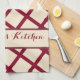 Add elegant style to your kitchen with this customizable burgundy and cream diagonal lattice kitchen towel featuring your personalized family name. The sophisticated diamond trellis pattern in rich burgundy on warm cream background transforms an everyday essential into a beautiful decorative accent. Your family name is prominently displayed in burgundy serif font on a cream ribbon banner with decorative pink accents and ornamental corner details. Personalize with your surname to create a custom kitchen piece. Soft, absorbent fabric is perfect for drying dishes, wiping counters, handling hot cookware, or displaying draped over your oven handle. Lint-free material is safe for glassware while providing excellent absorbency. The classic color palette adds elegance to traditional, contemporary, or transitional kitchens and coordinates with burgundy, cream, gold, or neutral décor. Durable construction withstands frequent washing while maintaining vibrant colors. Quick-drying fabric prevents mildew. Machine washable. Makes a thoughtful personalized housewarming gift, hostess present, wedding gift, or elegant kitchen upgrade.