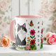 A sweet personalized coffee cup with a cute illustration of a black and white cat surrounded by flowers and butterflies in a paper quilling impasto style.