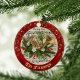 Personalize this ornament for yourself or as a gift for a music lover. The French horn in the center is decorated for Christmas with pine sprigs, holly leaves, red berries, and flowers, with a background of a vintage sheet music Christmas carol. Around the edge is simulated red metallic with gold music notes, also decorated with holiday greenery. The text is a matching gold color in a decorative vintage style font.