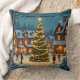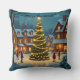 A serene winter scene at dusk featuring a large, festively decorated Christmas tree in the center of a snowy town square, surrounded by several red gift boxes with white ribbons. The tree is adorned with red and white ornaments and illuminated by yellow lights, topped with a bright yellow star. Four children on ice skates are positioned around the tree, dressed in warm winter attire including red, green, and brown coats and hats. Two large, brown houses with snow-covered roofs and chimneys are visible in the background, with warm yellow lights glowing from their windows. The houses are flanked by snow-covered trees and bushes, with bare trees on either side of the image. The sky above is a deep blue with a few clouds, and the atmosphere is peaceful and festive.