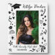 A fun graduation plaque featuring a senior photo framed by playful hand-drawn doodles including a graduation cap, diploma, stars, hearts, and confetti on a bold black background. The graduate's name appears in script at the top with the school name and class year below. A charming tabletop keepsake that doubles as a graduation party display or a lasting gift.
