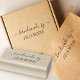 A personalized "handmade by" rubber stamp with a wood handle for your business, art projects, or creations. Customize it with your name in a beautiful script and simple, minimal font.