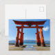 Celebrate one of Japan’s most iconic landmarks with this stunning Miyajima postcard. The floating torii gate of Itsukushima Shrine rises from calm waters in vivid vermilion, framed by distant mountains and a peaceful cityscape beneath a clear blue sky. This image captures the sacred elegance and architectural wonder of a site revered for centuries.