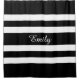 Elegant shower curtain with a white personalized name on bold black and white stripes. Easily personalize it by replacing the template name with your own intials in the template field. Matching bath decor available.