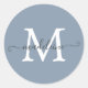 Elegant and minimal, this round monogram sticker features a bold white initial paired with your name in a modern calligraphy script across a soft dusty blue background. Perfect for labeling school supplies, gifts, party favors, stationery, or packaging for small businesses.