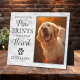 Pet dog memorial platte featuring a framed treasured foto of your beloved dog, modern white marble background, a paw print with a heart, a sympathy remembrance quote that reads "you left your paw prints forever on my heart" plus their name und date.