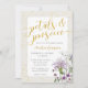 Die Blütenblätter und die Einladung zur Prosecco sind mit Wildblumen in den Farbtönen Perwinkle, Rosa und Weiß gestaltet. Die Formulierung ist in einem goldglänzenden Design, und der Hintergrund ist mit vielen goldenen Glitzern bespritzen.