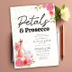 Eine elegante und moderne Braudusche "Petals and Prosecco" mit zarten ranunculus Blume in Aquarell, einer Champagnerflasche und zwei Gläsern, goldenem Eukalyptusblättern, Sprinklen und Glitzern (nicht echtes Gold, das ist ein digitaler Effekt) sowie moderner Kalligraphie.