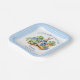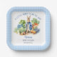 Peter Kaninchen mit einer blauen Jacke und Gartengemüse Babydusche Monogramm gedruckte Papier Teller Vorlage. Ein niedlicher Hase in einer blauen Jacke stehend im Veggie-Garten für einen Baby Duschkopf pastellblau Gingham personalisiert Babydusche Geschirr