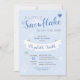 Design présente le texte "Un petit flocon de neige est en route" ainsi que des flocons de neige bleus et blancs sur un arrière - plan bleu. Le design est parfait pour un baby shower à thème hivernal. Le texte peut être personnalisable pour correspondre aux informations que vous devez mettre sur la carte d'invitation.