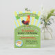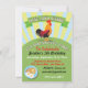Petit déjeuner Rise and Shine Invitation de fête d'anniversaire avec une assiette de délicieuses crêpes, oeufs & bacon, coq croisant contre herbe verte et un arrière - plan lever de soleil. Une fête amusante pour une fille ou un garçon. Illustration tirée à la main par McBooboo.