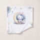 Serviette de bain super mignonne avec petit lapin blanc mignon portant une belle proue violette assise sur une belle lune avec quelques étoiles en chute d'or et quelques nuages bleus poussiéreux.