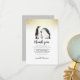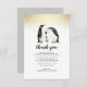 Une mignonne carte de remerciement avec un message réfléchi : "Le placard était vide, les affaires de notre bébé étaient peu nombreuses, mais que tout a changé à cause de vous ! Nous vous envoyons ce message avec un peu de réflexion : notre petit sera bientôt là pour utiliser le cadeau que vous avez apporté ! Merci d'avoir fait partie de notre baby shower." Ceci peut être modifié au texte de votre choix. Vos noms apparaissent en bas. Ci-dessus, "merci" est écrit en écriture de script moderne avec une aquarelle peinte à la main illustration d'une famille de pingouins. Au sommet, il y a des confettis en faux or. Ces cartes s'inversent à une couleur gris neutre pour le genre.