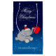 Beau éléphant avec casquette rouge et sac avec cadeaux de Noël sur arrière - plan bleu avec flocons de neige blancs