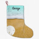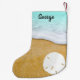 Impression recto verso sur les bas de Noël avec une scène de plage. Sable et surf avec un grand dollar de sable blanc et modèle de nom au sommet. Utilisé pour les garçons ou les filles, les adultes ou les enfants. Toute personne qui aime la plage appréciera ce design de la côte de mer.