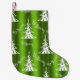 Un bas de Noël vert et blanc très festif, avec un motif de sapins blancs sur un arrière - plan vert métallique, et un accueil joyeux à la marée du jour, "Be Merry".