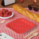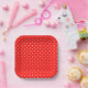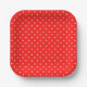 Papier Party Teller mit winzigen weißen Herzen auf hellrotem Hintergrund. Vergewissern Sie sich, dass Sie die Erholung der kleinen Herzen und kühnen Farben Papier Sammlung Karo.