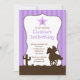 Commencez votre petite fête d'anniversaire douce de cow-girls outre de la droite avec notre invitation mignonne d'anniversaire de enfant de cow-girl comportant une cow-girl que l'équitation des heures a placé sur les bandes pourpres. Mignon pour une fête d'anniversaire occidentale pour un 3ème anniversaire. Visitez notre magasin pour regarder d'autres invitations mignonnes de fête d'anniversaire et en assortissant merci des notes, des autocollants et des timbres-poste. Illustrations du © JW