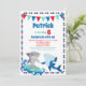 Une invitation d'anniversaire de requins malicieux pour votre garçon ou fille d'anniversaire. Doté de deux requins drôles avec une bordure à points mignons et des drapeaux en bleu, rouge et turquoise. Idéal pour les âges : 1ère 2ème 3ème 4ème 6ème 7ème 8ème 9ème 10ème 11ème 12ème