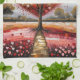 Ein hochsymbolisches und strukturiertes Gemälde mit einem zentralen Baum mit bloßen Ästen, dessen Blätter durch eine Vielzahl kleiner roter, weißer und rosa Herzen ersetzt werden. Der Baum ist gegen ein massives, schimmerndes goldenes Herz positioniert, das den Himmel füllt und einen mächtigen und skurrilen Hintergrund schafft. Der Vordergrund ist eine Landschaft abstrakter, horizontaler Bänder in verschiedenen Rosa- und Rottönen, die an ein kultiviertes Feld erinnern. Ein Pfad mit goldenen Kacheln führt vom Boden der Leinwand bis zum Fuß des Baumes. Der Gesamtstil ist reich an Textur und Symbolik, die Themen der Liebe, der Zuneigung und der Reise ins Herz.